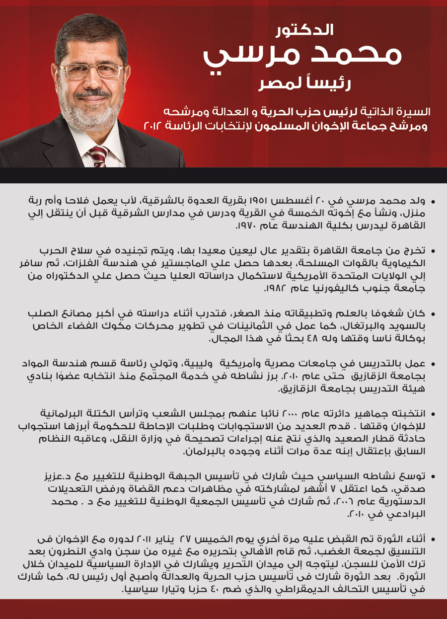 أعزاءنا زوار "إخوان أون لاين".. شاركوا في دعم حملة "مرسي رئيسًا" بنشر هذه البيانات عن مرشح مشروع النهضة..
