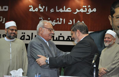 والتقى الدكتور محمد مرسي بعلماء الأزهر في مؤتمر "علماء الأمة.. رواد النهضة" اليوم بقاعة الأزهر للمؤتمرات، وأكد أن الشعب يتوق إلى العمائم، ويرى فيها خيرًا كثيرًا، موضحًا أنه عندما كان يقرأ في تاريخ الأزهر الطويل المشرف رأى أن علماء الأزهر كانوا قادة الأمة في جميع المجالات سعيًا على نهج السلف الصالح.