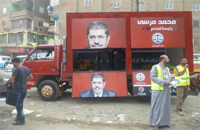 كما رفعت السيارات المشاركة في المسيرة اللافتات والبوسترات الخاصة بالدكتور مرسي, وتم تذكير الأهالي من خلال المسيرة بموعد الانتخابات والرمز الانتخابي لمرسي "الميزان".
