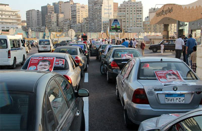 ونظم المئات من أعضاء النقابات المهنية بالإسكندرية، مسيرة سيارات لدعم وتأييد الدكتور محمد مرسي رئيسًا لمصر، اليوم، بطول كورنيش الإسكندرية.