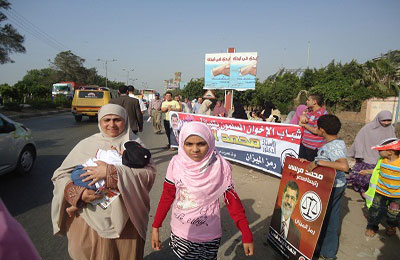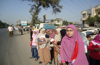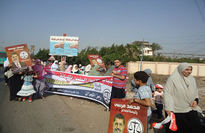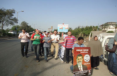 تلبية للدعوة التي أطلقتها حملة "مرسي رئيسًا" خرج، عصر اليوم، الآلاف من الإخوان المسلمين وحزب الحرية والعدالة ومؤيدي الدكتور محمد مرسي مرشح الحزب والجماعة لرئاسة الجمهورية؛ للمشاركة في السلسلة البشرية التي تبدأ من الإسكندرية حتى أسوان وهم يهتفون "علم علم علي الميزان.. إن شاء الله مرسي كسبان".