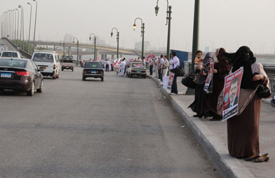واصطف الآلاف من حملة "مرسي رئيسًا" وحزب الحرية والعدالة والإخوان المسلمين بالقاهرة، في سلسلة بشرية رافعين لافتات وصور د. مرسي، بالإضافة إلى أعلام مصر والحزب وصور مشروع النهضة الذي يحمله د. مرسي كبرنامج انتخابي له.