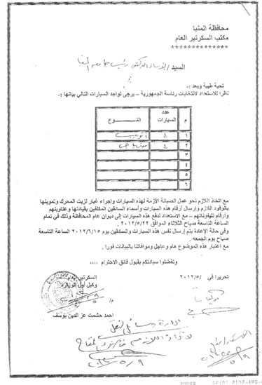 وقال د. المغازي لـ(إخوان أون لاين): إن الخبر عارٍ تمامًا عن الصحة، مشيرًا إلى أن أتوبيسات وميني باصات الجامعة شاركت في انتخابات رئاسة الجمهورية بناء على الفاكس الوارد من المهندس أحمد حشمت عز الدين سكرتير عام محافظة المنيا، والذي خاطب فيه الدكتور محمد أحمد شريف رئيس الجامعة في 9 مايو 2012م بطلب المحافظة من الجامعة عدد (4) أتوبيسات و(4) ميني باصات للمشاركة في نقل القضاة والمستشارين إلى مقارهم الانتخابية، لافتًا إلى طلب المحافظة نفس الطلب في مختلف الانتخابات والاستفتاءات من جميع المؤسسات الحكومية بالمحافظة.
