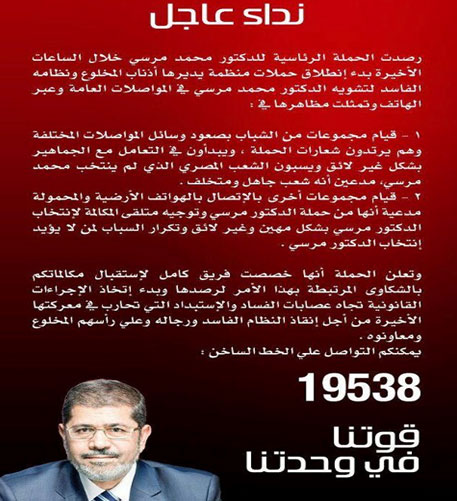 وأضافت الحملة كذلك أنها رصدت اتصال مجموعات بالهواتف الأرضية والمحمولة، مدعيةً أنها من حملة الدكتور مرسي وتوجيه متلقي المكالمة بشكل مهين وغير لائق وتكرار السباب لمن يؤيد انتخاب د. مرسي.