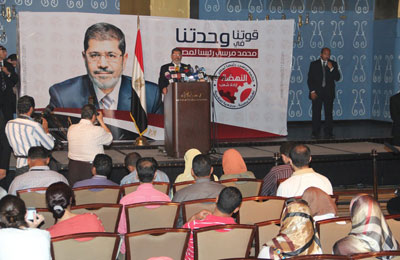 وتعهَّد د. مرسي مجددًا بأن يكون الرئيس خادمًا للشعب وأجيرًا عنده؛ لأن الشعب هو من يأتي بالرئيس بإرادته الحرة، وأنه لن يخون الله في الشعب ولا في هذا الوطن.
