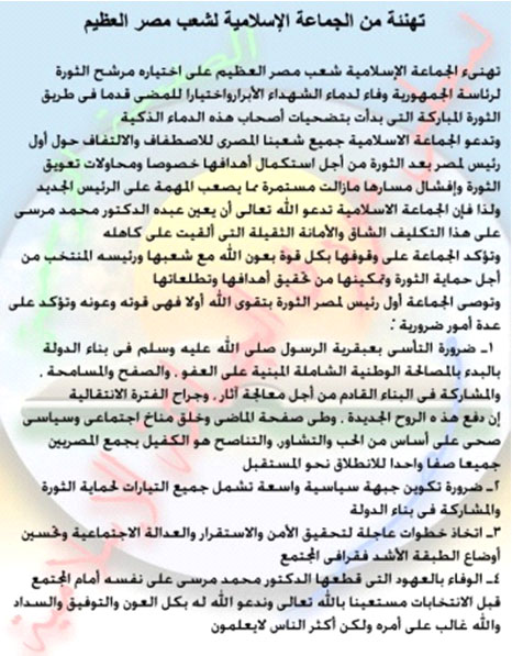 ودعت الجماعة- في بيان لها اليوم- الشعب المصري للاصطفاف حول أول رئيس لمصر بعد الثورة لاستكمال أهدافها، خاصةً مع المحاولات المستمرة لتعويق الثورة وإفشال مسارها؛ مما يصعِّب المهمة على الرئيس الجديد، مؤكدةً وقوفها بكل قوة مع الرئيس المنتخب لحماية الثورة وتمكينها من تحقيق أهدافها.