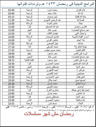 ويقدم كل من محمد السجيني وأحمد المراكبي وأحمد غالي برنامج "الرحمة في رمضان" في الثانية والربع ظهرًا، ويليه برنامج "الصيدلية المنسية" للدكتور أسامة حجازي والذي يذاع في الثالثة و25 دقيقة عصرًا، كما يقدم الشيخ أيمن خليل برنامج "فقه الصيام" في الرابعة إلا الثلث عصرًا.