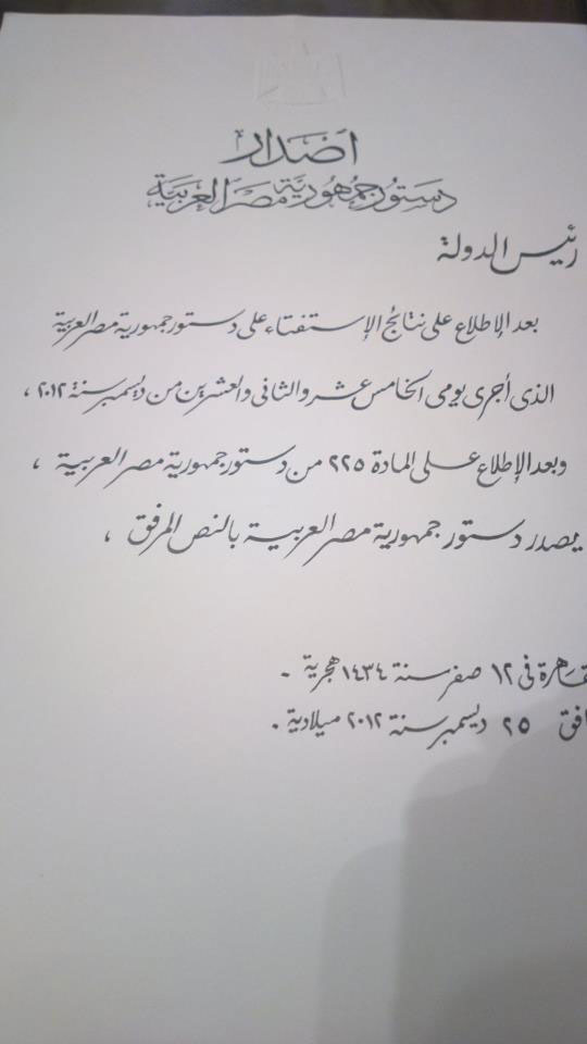 أعلن الدكتور ياسر علي المتحدث الرسمي باسم رئاسة الجمهورية أن الرئيس محمد مرسي وقع على مرسوم إنفاذ الدستور المصري الجديد؛ وذلك بعد أن انعقدت الإرادة الشعبية على الموافقة عليه كما أعلنت ذلك اللجنة العليا للانتخابات مساء الثلاثاء.