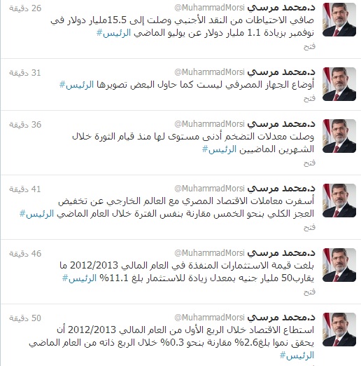 أكد الرئيس محمد مرسي أن الاقتصاد المصري استطاع خلال الربع الأول من العام المالي 2012/2013 أن يحقق نموًا بلغ 2.6% مقارنة بنحو 0.3% خلال الربع ذاته من العام الماضي.