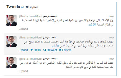أكد الدكتور محمد مرسي، رئيس الجمهورية، أن أعداد السائحين زادت في الأربعة أشهر الماضية مسجلة 4 ملايين سائح، وهي ضعف الأعداد التي سجلت في 6 أشهر من العام الماضي، مضيفًا أن عوائد قناة السويس ارتفعت منذ يوليو وحتى أكتوبر بنحو مليارَي دولار وهي أكبر نسبة سجلتها القناة منذ فترة بعيدة.واستنكر الرئيس مرسي- خلال تغريدة له على موقع التواصل الاجتماعي "تويتر"- أعمال العنف من قبل بعض القوى السياسية التي تؤثر بالسلب على قطاع السياحة، قائلاً: لولا الأحداث التي خرج فيها البعض عن سلمية عمل السياسي لاستمرت نسبة الزيادة المضطردة في قطاع السياحة .