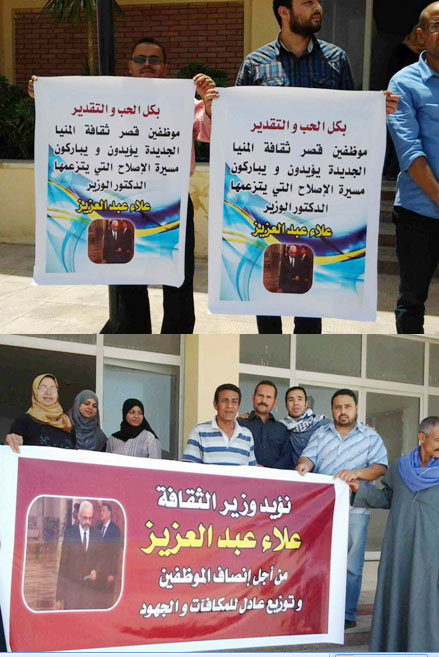 نظم عدد من موظفي قصور الثقافة بالمنيا وقفة تأييد للدكتور علاء عبد العزيز وزير الثقافة على قراراته الأخيرة, ورفعوا عددًا من اللافتات التي تؤيد مسيرة الإصلاح التي اتخذها الوزير خلال الفترة الماضية، مؤكدين أهمية تدعيم الوزير من أجل إنصاف موظفي الثقافة في مكافآت وجهود عادلة.