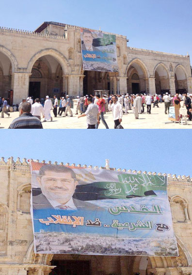 ورفع مصلو المسجد الأقصى صورة الرئيس مرسي أعلى المسجد مكتوبًا عليها "القدس... مع الشرعية... ضد الانقلاب".
