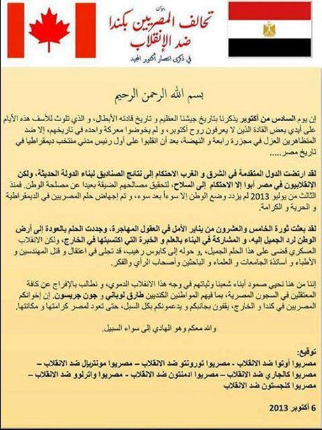 طالب "تحالف المصريين بكندا ضد الانقلاب" بالإفراج الفوري عن جميع المعتقلين السياسيين وعودة أبناء الجيش المصري الحاليين إلى الروح التي كان عليها أبطال مصر في السادس من أكتوبر، مؤكدين أن المصريين في كندا يقفون بجانب إخوانهم في الداخل ويدعمونهم بكل السبل، حتى تعود لمصر كرامتها ومكانتها.