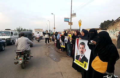 رفع المشاركون في السلسلة شارات رابعة العدوية رمز الصمود وصور الرئيس الشرعي للبلاد الدكتور محمد مرسي، وبعض اللافتات الرافضة لحكم العسكر.