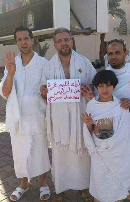 وتظهر الصورة ٣ رجال وطفلاً في زي الإحرام يرفعون شعار رابعة العدوية وورقة مكتوبًا عليها "لبيك اللهم عمرة عن الرئيس محمد مرسي".