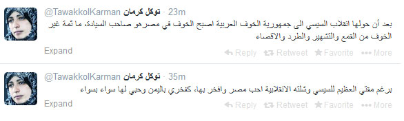 وتابعت: "برغم مقتي العظيم للسيسي وشلته الانقلابية أحب مصر وأفخر بها، كفخري باليمن وحبي لها سواء بسواء".
