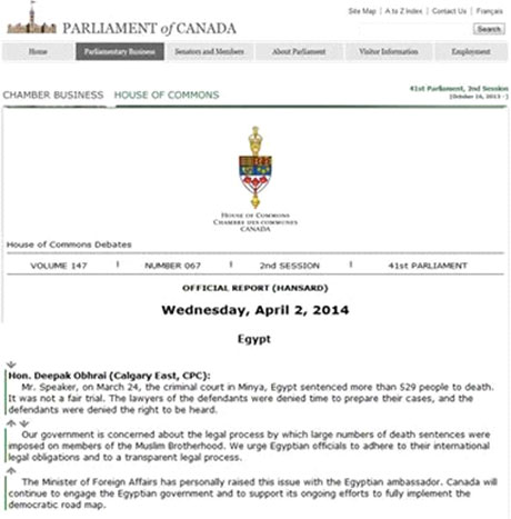 في رد فعل رسمي على الشائعات التي انتشرت خلال الساعات الماضية من أن البرلمان الكندي اعتبر جماعة الاخوان المسلمين جماعة إرهابية، نقلت شبكة رصد الإخبارية القرار الحقيقي الذي اتخذه البرلمان الكندي يوم الأربعاء الماضي من موقع البرلمان الكندي نفسه، والذي يهاجم حكومة الانقلاب في مصر بشدة وينتصر للإخوان المسلمين نتيجة الحكم الهزلي بإعدام 529 من رافضي الانقلاب، ويطالب الحكومة المصرية بالتزام المعايير الدولية للعدالة والقضاء، كما أوضح أن وزير الخارجية الكندي أوصل بنفسه هذه الطلبات للسفير المصري في كندا.
