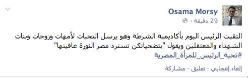 وقال أسامة محمد مرسي في تدوينة عبر موقع "فيس بوك": التقيت الرئيس اليوم بأكاديمية الشرطة وهو يرسل التحيات لأمهات وزوجات وبنات الشهداء والمعتقلين ويقول "بتضحياتكن تسترد مصر الثورة عافيتها".