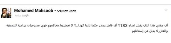 وتابع في تدوينة له على الفيس بوك "أي مفتي هذا الذي يقبل بإعدام 183؟ أي قاض يصدر حكما نازيًّا كهذا؟ لا تحضروا محاكمهم فهي مسرحيات درامية للتصفية والقتل.. لا بديل عن إسقاطهم".