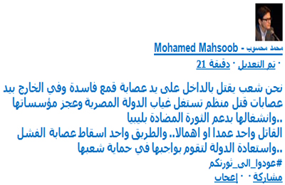 وقال عبر "فيسبوك": نحن شعب يقتل بالداخل على يد عصابة قمع فاسدة، وفي الخارج بيد عصابات قتل منظم تستغل غياب الدولة المصرية وعجز مؤسساتها وانشغالها بدعم الثورة المضادة بليبيا.