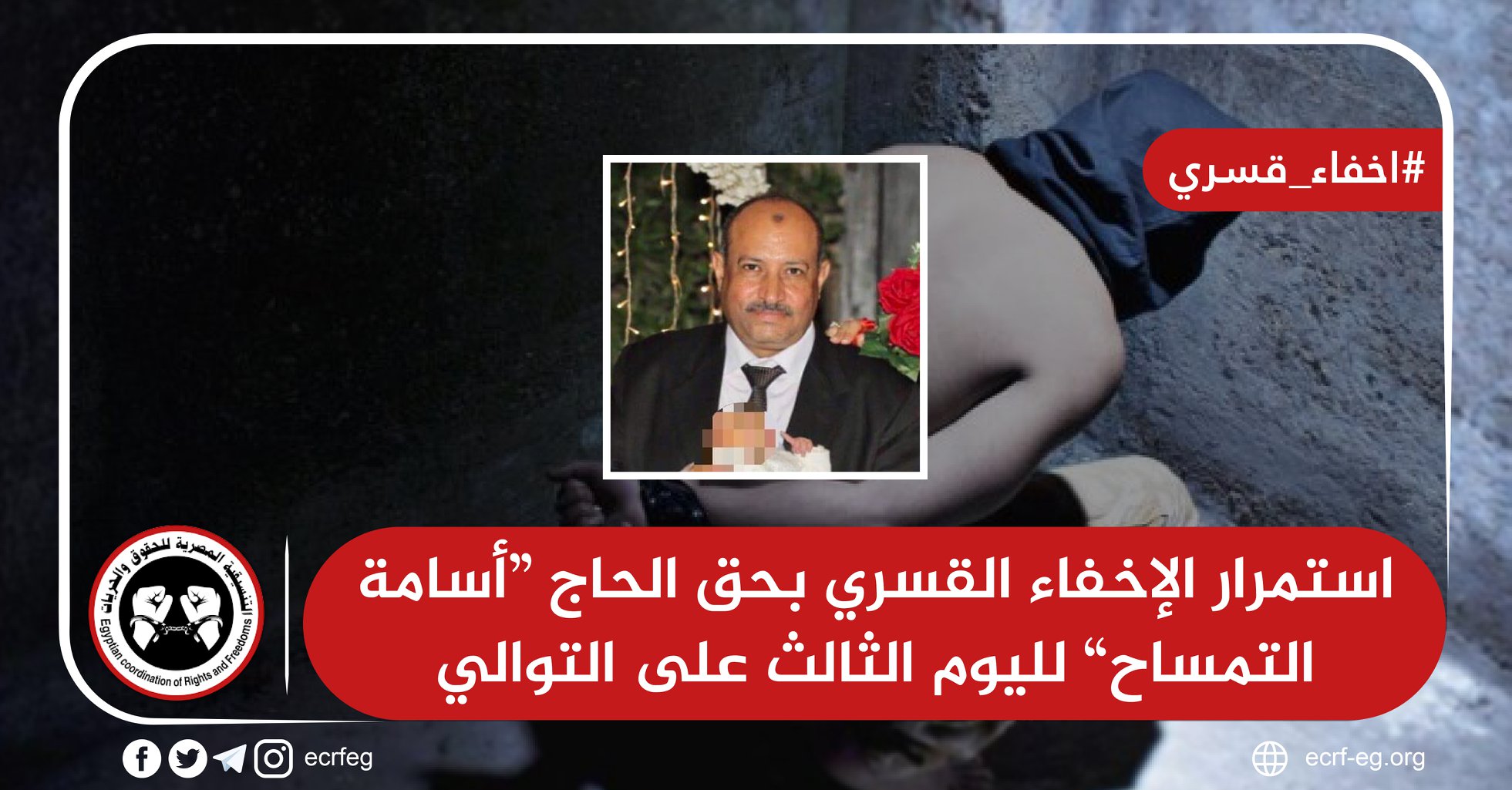ومن المنوفية وثقت "التنسيقية" استمرار إخفاء أسامة التمساح، البالغ من العمر 56 عامًا، لليوم الرابع على التوالي بعد اعتقاله من محل إقامته بالقاهرة مساء الأربعاء 4 نوفمبر الجارى، واقتياده إلى جهة مجهولة، ولم يستدل أحد إلى مكانه حتى الآن.