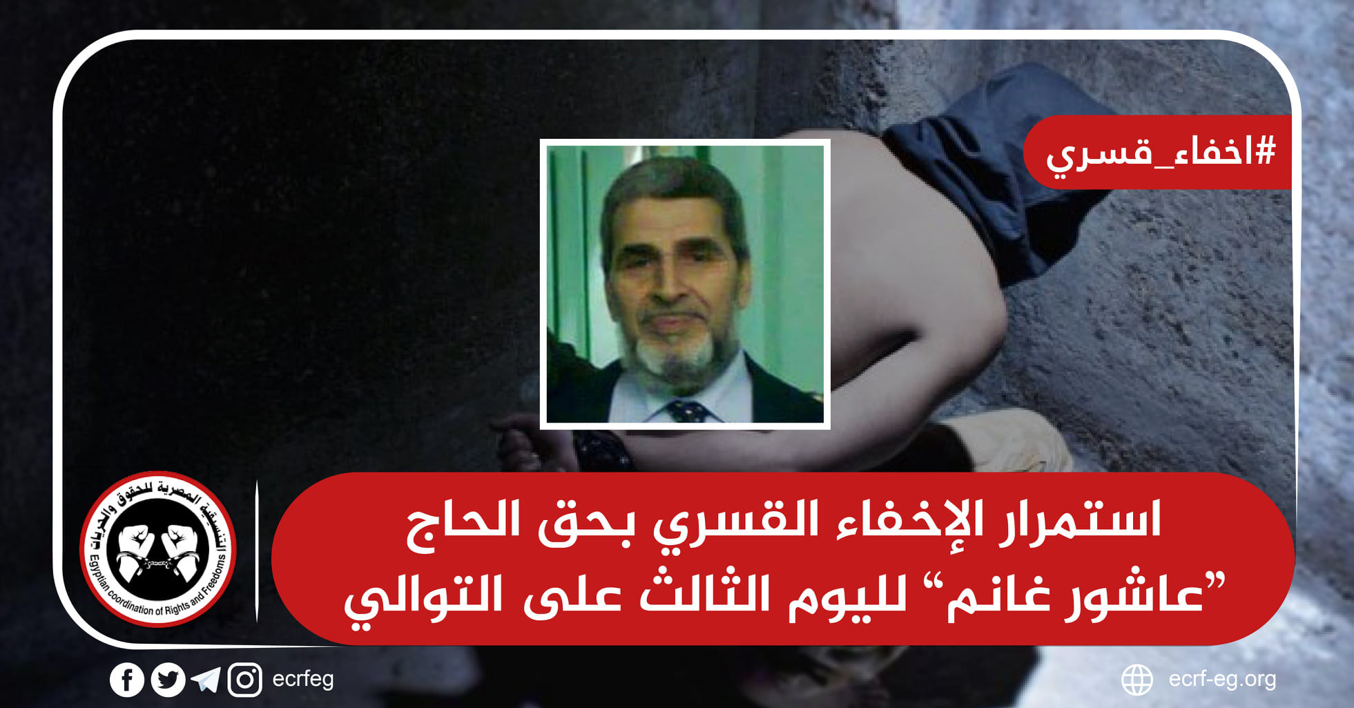 كما تخفى قوات الانقلاب بالقاهر المواطن عاشور غانم، البالغ من العمر 75 عامًا، لليوم الرابع على التوالي. وذلك منذ اعتقاله مساء الأربعاء 4 نوفمبر الماضي، من مقر إقامته بالقاهرة، واقتياده إلى جهة مجهولة، ولم يستدل أحد على مكانه حتى الآن.