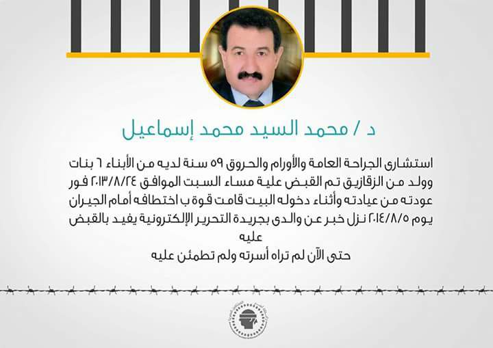 ومن بين المختطفين الطبيب محمد السيد إسماعيل، وهو المدير الأسبق لمستشفى "القنايات المركزي"محافظة الشرقية. فمنذ اعتقاله من أمام منزله بمدينة الزقازيق في 24 أغسطس عام 2013 ترفض قوات نظام السيسى الكشف عن مكان احتجازه وسط معلومات غير رسمية لأسرته عن وجوه بسجن "العزولي" بالإسماعيلية.