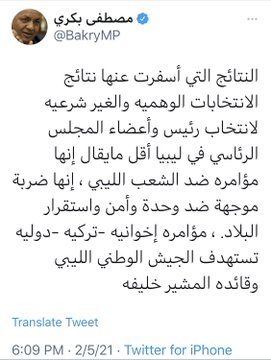 وأغضبت النتائج أنصار الخاسر عقيلة صالح رئيس برلمان طبرق, وداعمي الانقلابي حفتر في مصر، وعبر "مصطفى بكري" عن ذلك بقوله: إن "النتائج التي أسفرت عنها نتائج الانتخابات الوهميه والغير شرعيه لانتخاب رئيس وأعضاء المجلس الرئاسي في ليبيا أقل مايقال إنها مؤامره ضد الشعب الليبي ، إنها ضربة موجهة ضد وحدة وأمن واستقرار البلاد. ، مؤامره إخوانيه -تركيه -دوليه ...".