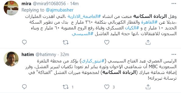 وعلق حساب "تيتو"، "السيسي بعد شماعة الإخوان خلق لنفسة شماعة جديدة للفشل اسمها الزيادة السكانية واللي هيقولة اي حاجة هيقولة الزيادة السكانية .. السؤال الوقتي يا عم يلي مخلف 4حلاليف كنت بتطفحهم منين وانتا قاعد 10سنين تلاجتك فيها مية بس؟!".