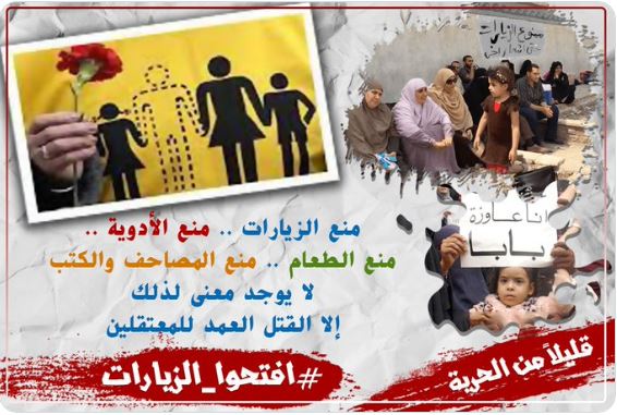 راج على مواقع التواصل الاجتماعي هاشتاج #افتحوا_الزيارات الذي يحذر من عواقب وخيمة جراء قائمة المنع من الأدوية والزيارات والطعام والمصاحف والملابس التي يتعرض لها المعتقلون في سجون الانقلاب، وهو الإجراء الذي اتخذه الانقلاب قبل عامين، وقام بتعميمه على كل سجون مصر، ومقار الاحتجاز إلا القليل منها.