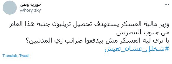 وهاجم مالية الانقلاب وقال "وزير مالية العسكر يستهدف تحصيل تريليون جنيه هذا العام من جيوب المصريين يا ترى ليه العسكر مش بيدفعوا ضرائب زي المدنيين؟ ".