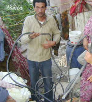 عبرنا فوق ألواح جريد النخل فوق ترعة الصرف الصحي، متوجهين إلى البر الثاني، فقابلنا مجدي عبد النبي "مقاول" الذي قال: إن المياه الجوفية الخارجة من الأرض تختلف حسب إمكانيات كل فرد، فالفقراء لا يستطيعون حفر طلمبة أكثر من 6 متر تحت الأرض، وبالتالي لا تكون درجة نقائها كبيرة، بل تميل إلى اللون الأصفر لاختلاطها بمياه الصرف الصحي، أما ميسورو الحال يقومون بحفر طلمبة على بعد 30 مترًا؛ لأنها تتكلف 2000 أو 3000 جنيه!!.